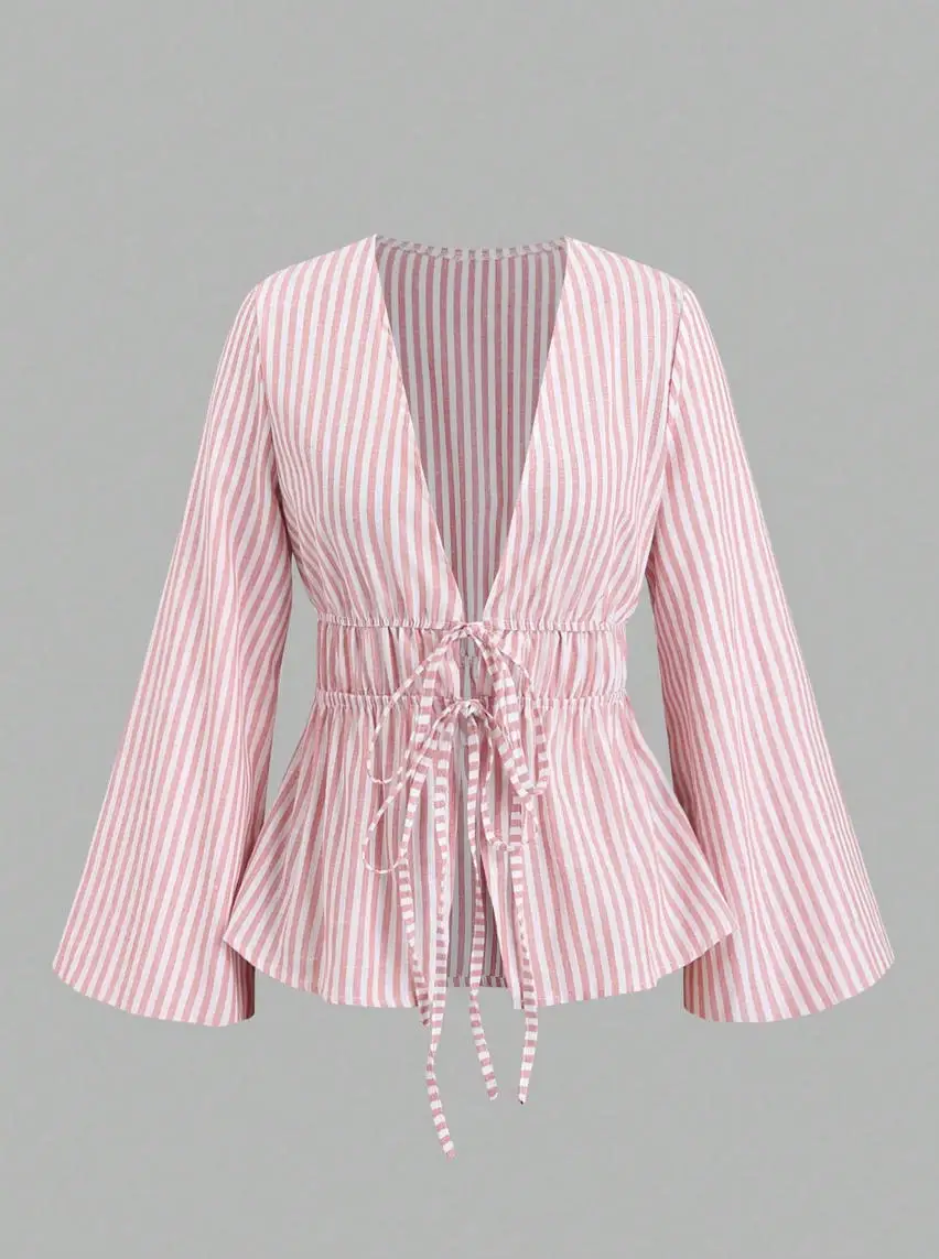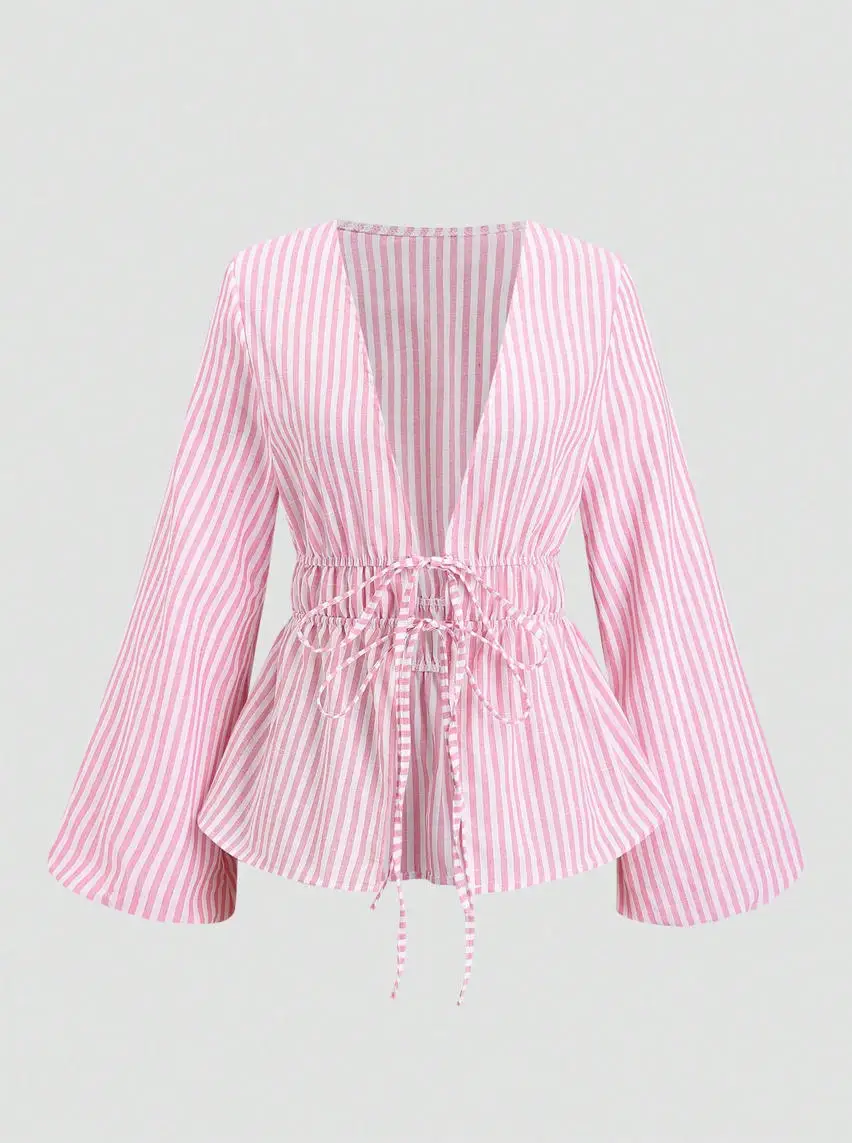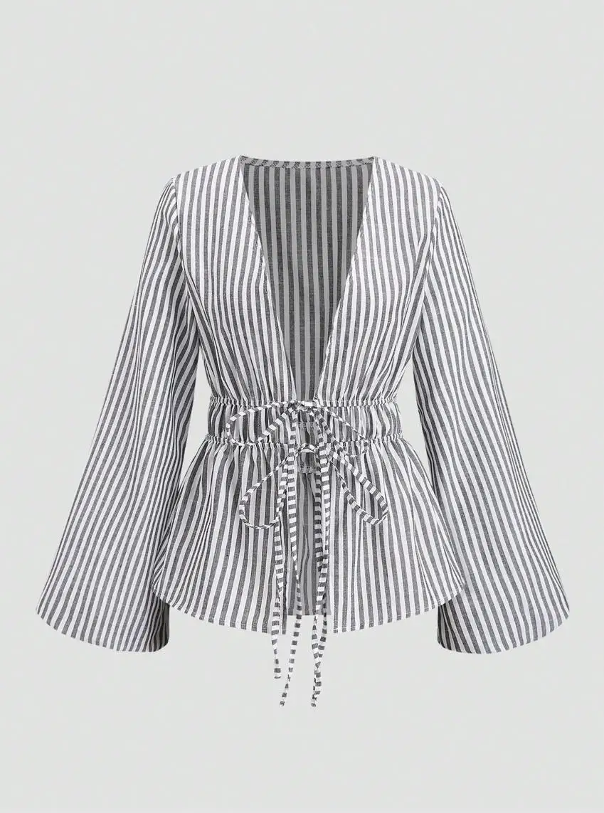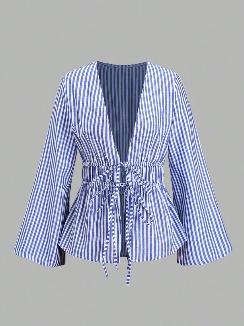 Autumn New European American Casual Striped Cotton Lantern Sleeve Lace-up Long Sleeve Cardigan Shirt Cross-border